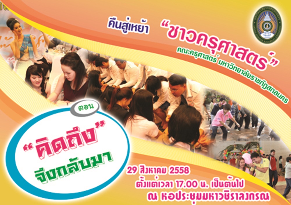 เมื่อวันที่ 29 สิงหาคม 2558 คณะครุศาสตร์ มหาวิทยาลัยราชภัฏสกลนคร จัดงานคืนสู่เหย้า “ชาวครุศาสตร์” ตอน “คิดถึง” จึงกลับมา ณ หอประชุมมหาวชิราลงกรณ มหาวิทยาลัยราชภัฏสกลนคร อ่านเพิ่มเติม “งานคืนสู่เหย้า “ชาวครุศาสตร์””