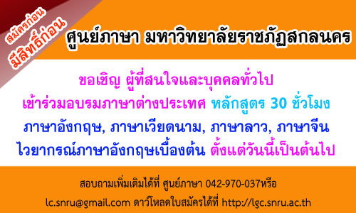 โครงการอบรมภาษาต่างประเทศส าหรับบุคคลทั่วไป ศูนย์ภาษา มหาวิทยาลัยราชภัฏสกลนครเปิดอบรมภาษาต่างประเทศ หลักสูตร 30 ชั่วโมง